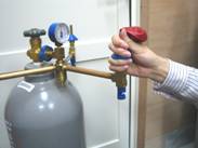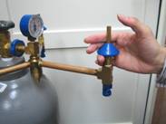 A ヘリウムボンベバルブを開け(時計の反対方向左)トリプルスピードインフレーターの、3方の出口(ゴム風船取付け位置)のブルーのインフレーター出口より、空気抜きのため手で軽く押し下げて空気を抜いてください。